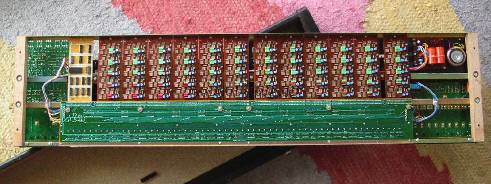 The bottom side of the frame with 12 brown PCB board for the filtering of each sounds. Each board covering one note of a scale in five octaves. There are little differences in the values of the capacitors on each board.